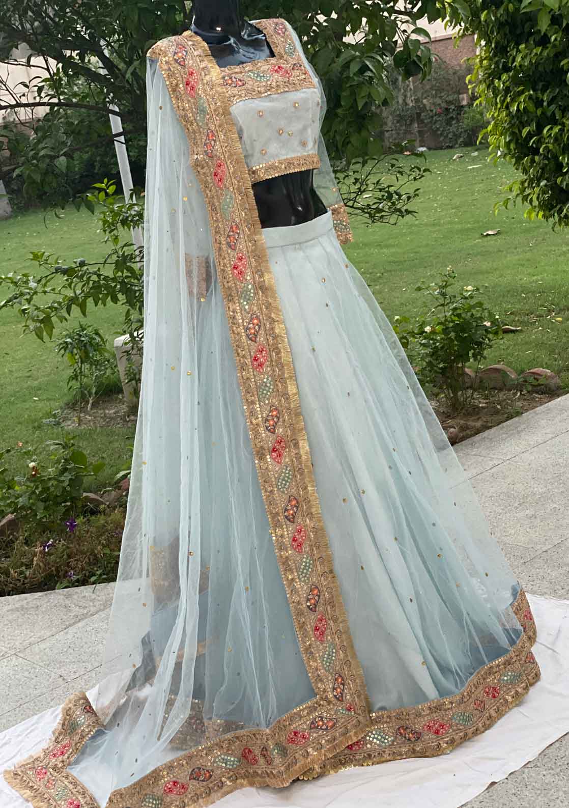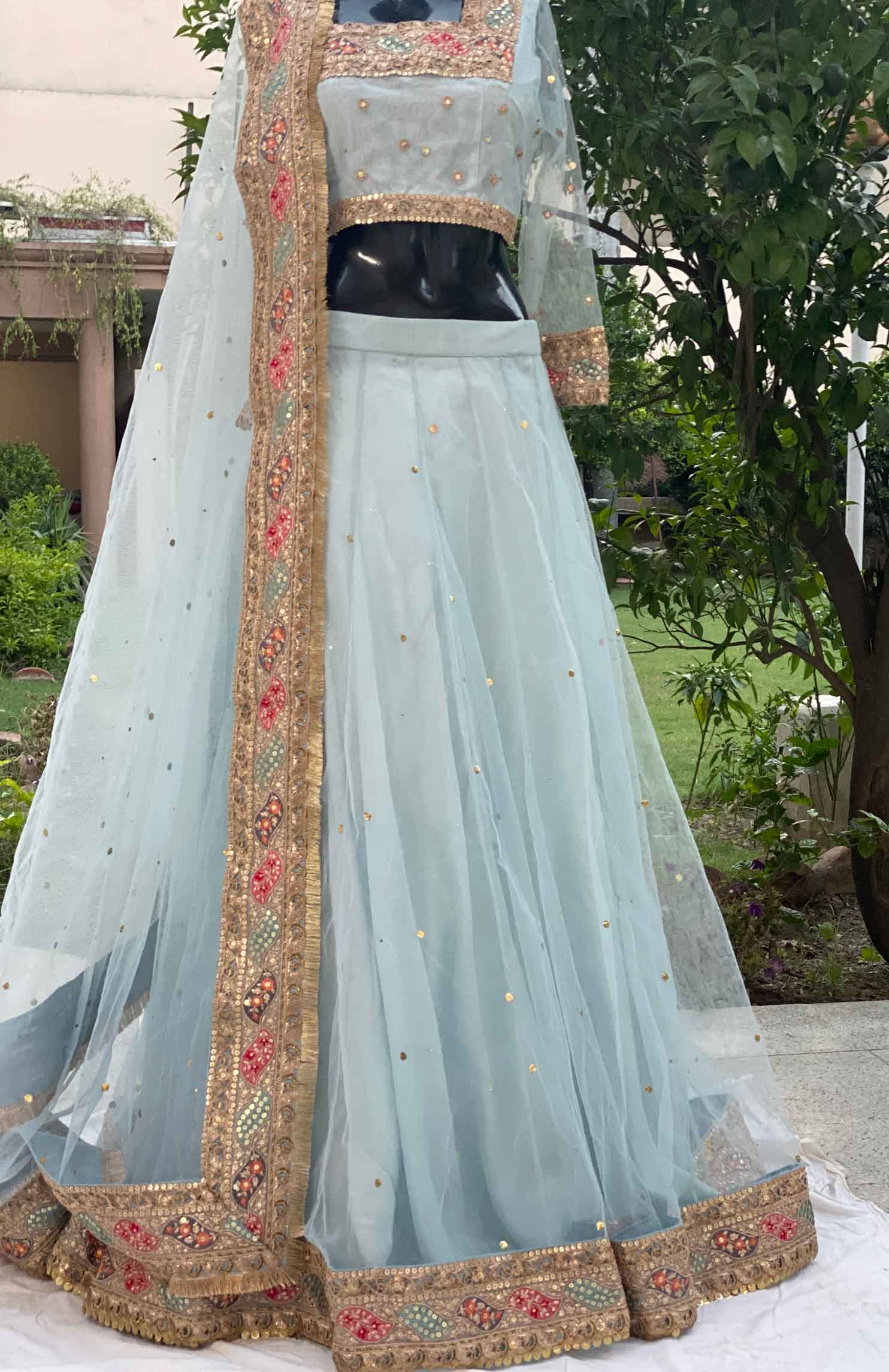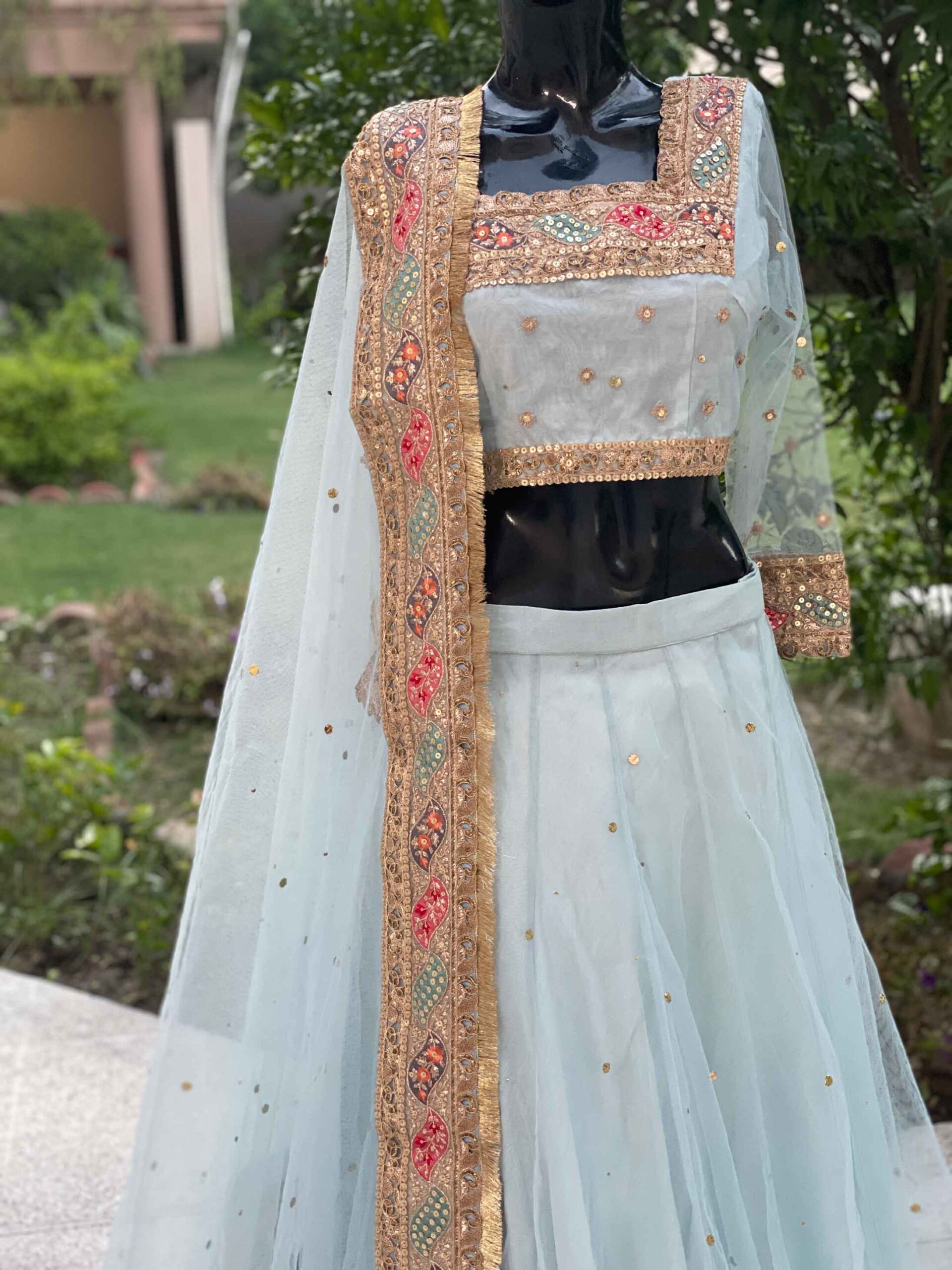 - Border work on lehenga and choli neck, and arms.