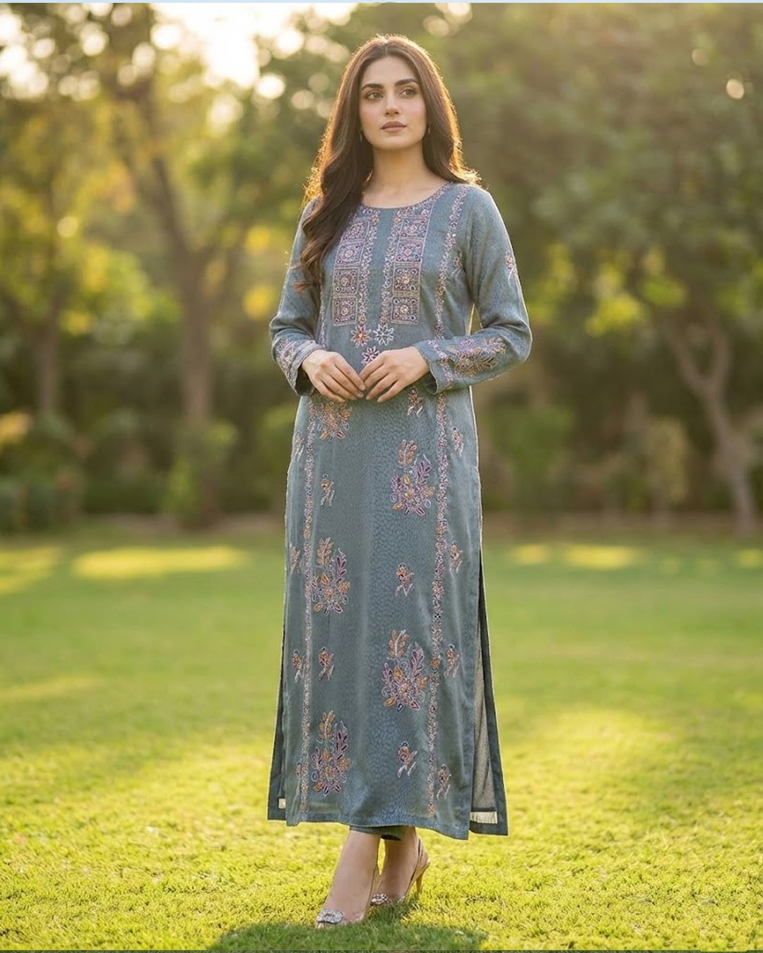 Kaftan style in Dusty teal shade lavishly adorned with elaborate Resham intricate hand Embroidery ,tilla work adding dabka and sequence on the shirt Front and sleeves , silhouette for the festive season effectlessly a luxurious vibe.