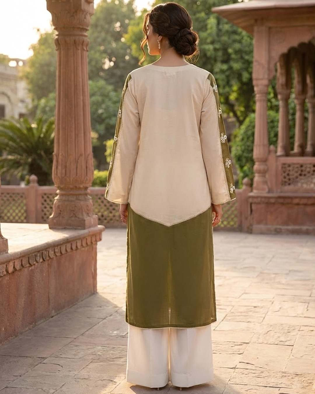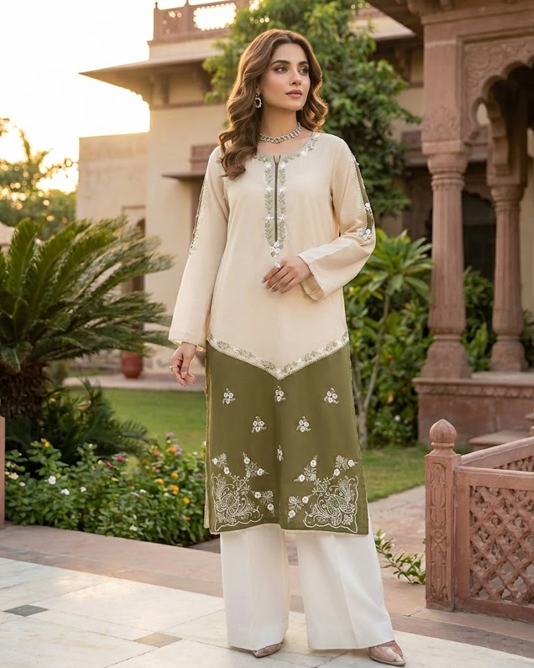 - Hand embroidery, motives, spray work on the daman, neck, and sleeves