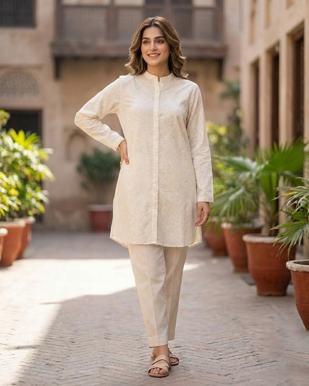 - Hand embroidery on the collar, cuffs, and wide pant hems