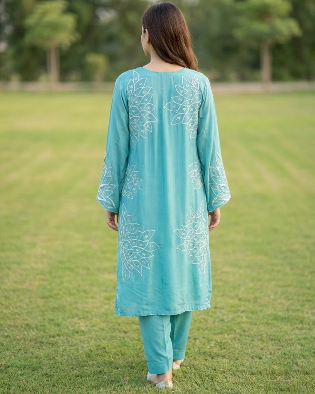 - Festive Embroidered Work on the Front, Back, and Sleeves with Fancy Hand Work, Giving the Outfit a Stunning Look