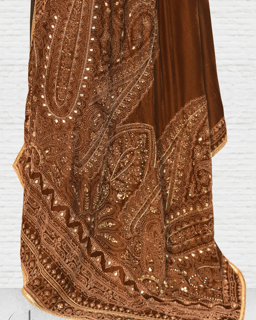 - Featuring Velvet shawl with zardozi work, sequins, pearls, over screen print. Finishing shawl with tissue lining and lace.