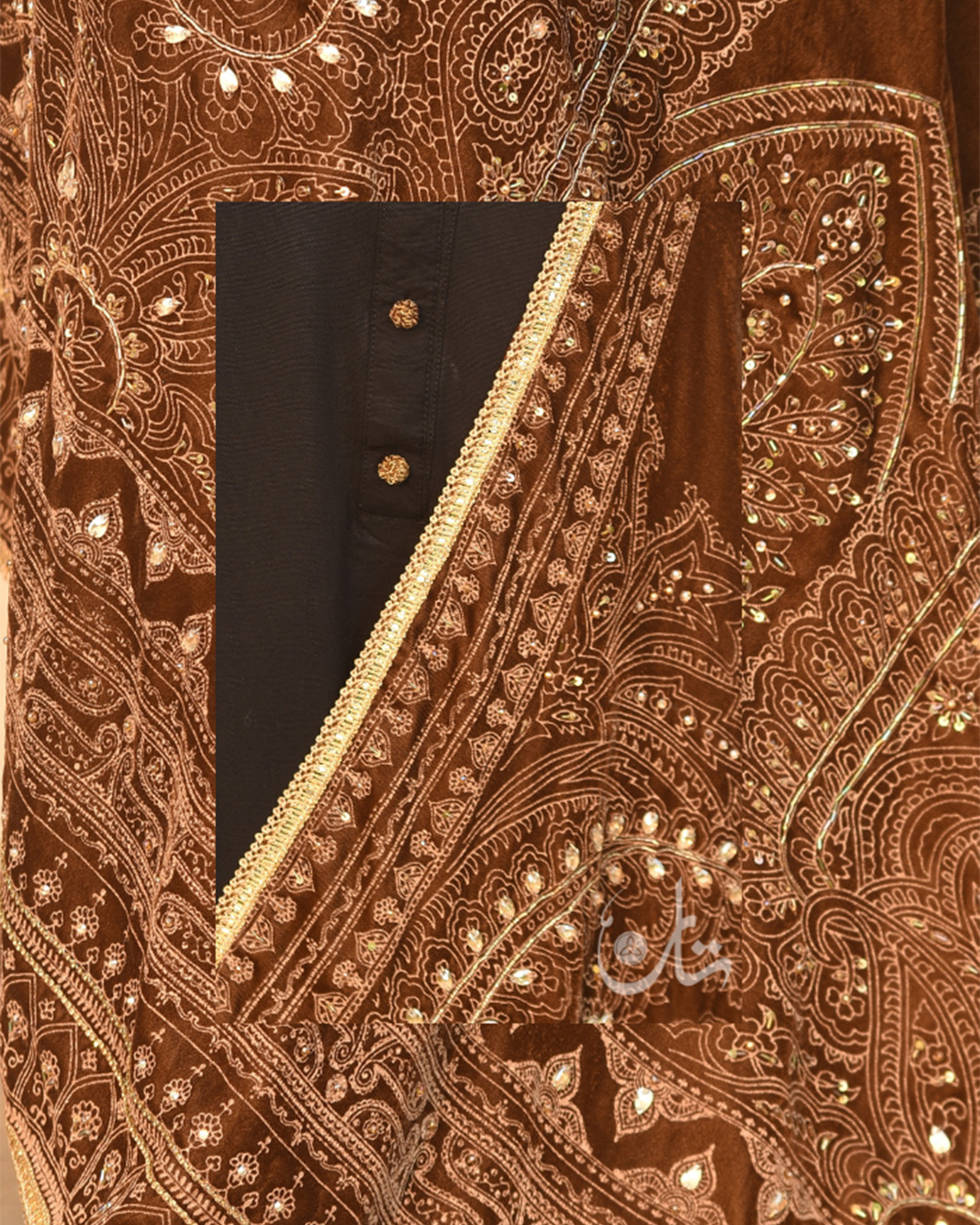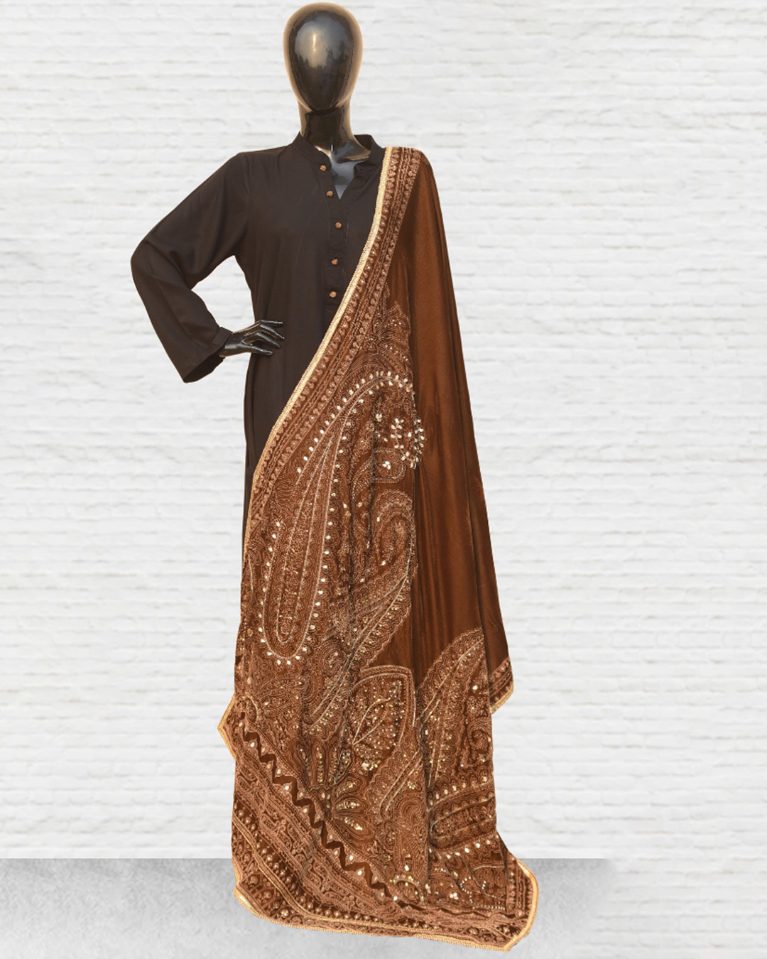 - Working in a style of traditional handicrafts, Taan Shop creates a sweet and lovely shawl. This shawl is hand embellished from pure velvet blend, which features a sequence crystal, embroidered patch on borders with lace finishing, lining with tissue fabric. Designed by Taan Shop, this exquisite lightweight shawl is painted by hand and signed.